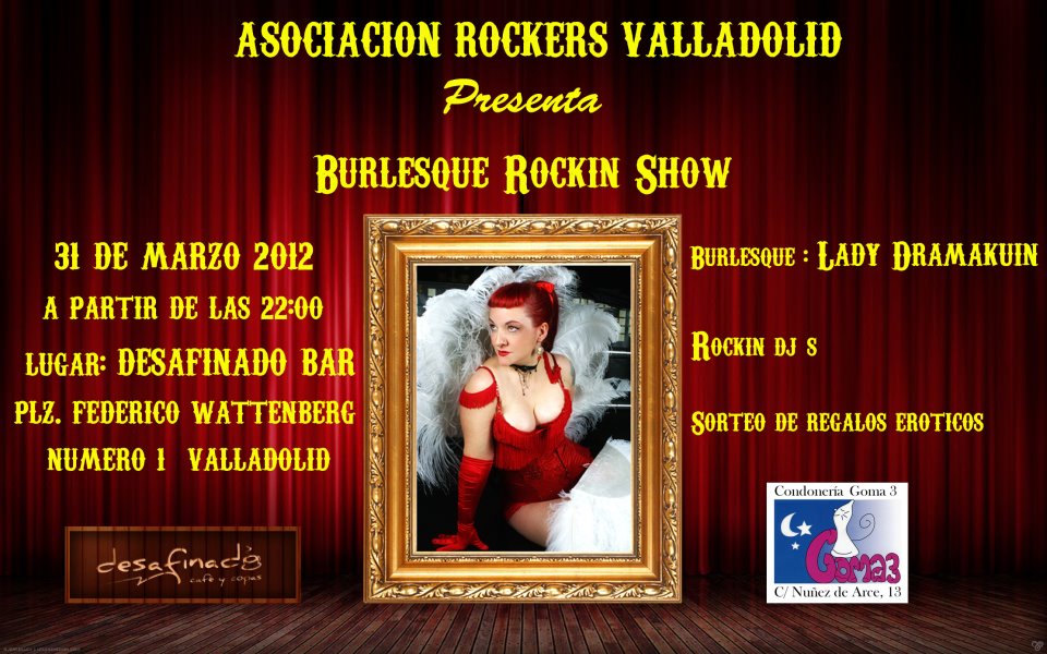 Nuestros amigos y colaboradores del Desafinado nos informan del a Fiesta Burlesque que se realizará el próximo sábado día 31 en colaboración con la Asociación de Rockers de Valladolid, sin duda promete ser una entretenida forma de iniciar la Semana Santa.